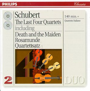 Though he only has four instruments to work with instead of a whole orchestra, Schubert's last quartet is just as long and intense as his last symphony. The crescendo at the beginning is a microcosm of the piece as a whole; the intensity builds throughout the piece and comes to a climax after nearly fifty minutes of music. The Quartetto Italiano's classic recording comes with splendid performances of Schubert's other three late quartets, including the great unfinished "Quartettsatz." |